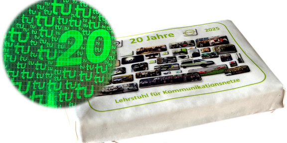 The anniversary was celebrated with a special cake featuring highlights of research and teaching on communication networks in Dortmund since 2005.
