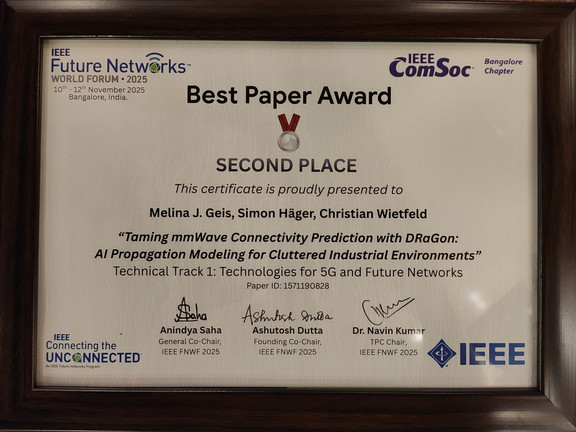 • M. Geis, S. Häger, C. Wietfeld, "Taming mmWave Connectivity Prediction with DRaGon: AI Propagation Modeling for Cluttered Industrial Environments," in IEEE Future Networks World Forum (FNWF), Bangalore, India, November 2025 (awarded with 2nd Best Paper Award) [pdf]
